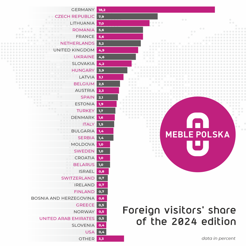 The most important trade partner of the Polish furniture industry is Germany. This is where the largest portion of Polish furniture exports goes. Therefore, for years, buyers from Germany have been by far the largest group among foreign visitors. This year, German traders were particularly well represented in Poznań. They constituted as much as 18.2 percent of buyers from abroad – 15.9% a year ago. This time, the Czechs took second place – 7.9%. Guests from Lithuania, Romania, the Netherlands, Great Britain, Ukraine, Slovakia, Hungary and Latvia also participated in the fair in large numbers.